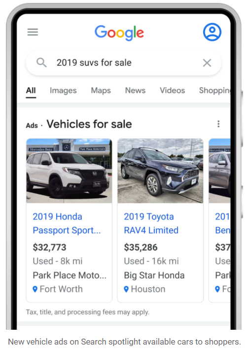 When people search for cars for sale, this new ad format will show nearby vehicles available for purchase.