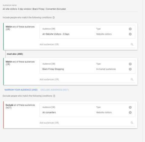 By creating combined audiences for website visitors who are part of the Black Friday marketplace audience, they ensure that their ads will only be shown to users who meet all of these criteria and search for specific keywords on Google.